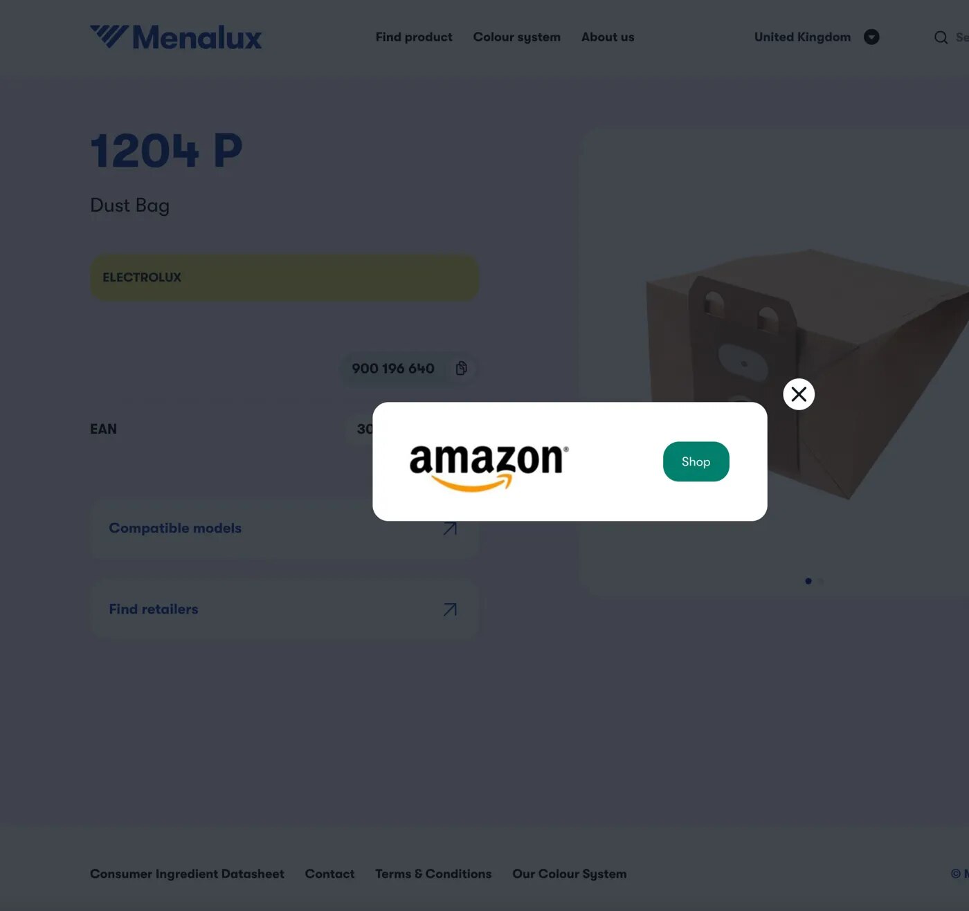 Utilizza il modulo Trova prodotti sul sito web di Menalux. Seleziona una categoria quindi il marchio, la serie e il modello del tuo aspirapolvere. Fai clic sul prodotto mostrato e cerca il colore corrispondente e il riferimento del sacchetto di 4 cifre.
