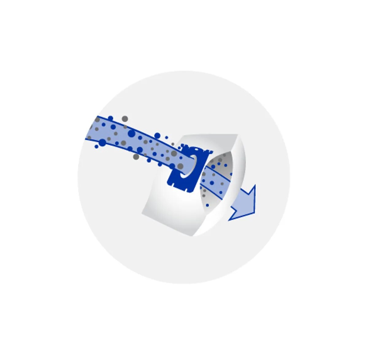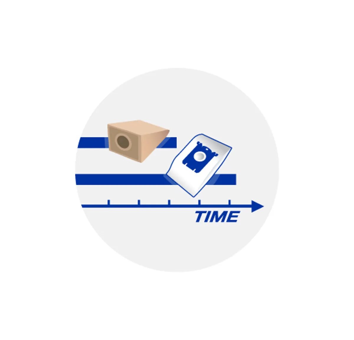 I sacchetti realizzati con DURAFLOW™ Fresh sintetico consentono un utilizzo fino al 50% più lungo rispetto ai normali sacchetti raccoglipolvere di carta. Questo grazie alla struttura del materiale, che offre al sacchetto una migliore capacità di trattenuta della polvere e, al contempo, mantiene la potenza di aspirazione costantemente elevata man mano che il sacchetto si riempie.